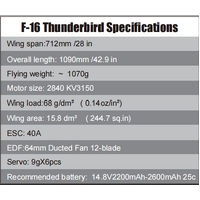 1. Electronic configuration: high-quality 40A ESC, high-power 2840-KV3150 motor, high-efficiency 64mm 11-blade ducted fan unit, high-precision digital servo.