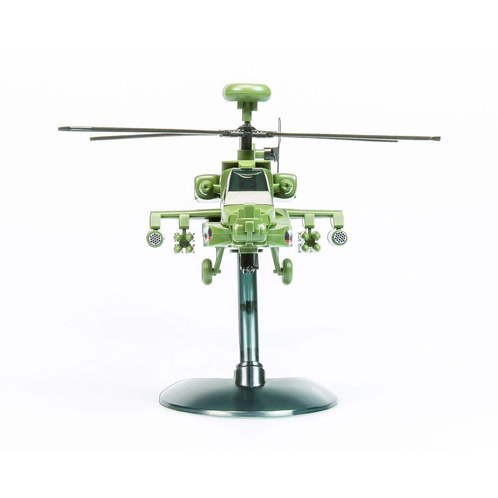 Construct your very own Apache Helicopter! This model of the twin-engine attack helicopter features spinning four-blade main and tail rotors. In true army green, this piece is 129mm in height once placed on the stand. This model has a total of 37 parts with 3 additional parts for the stand.