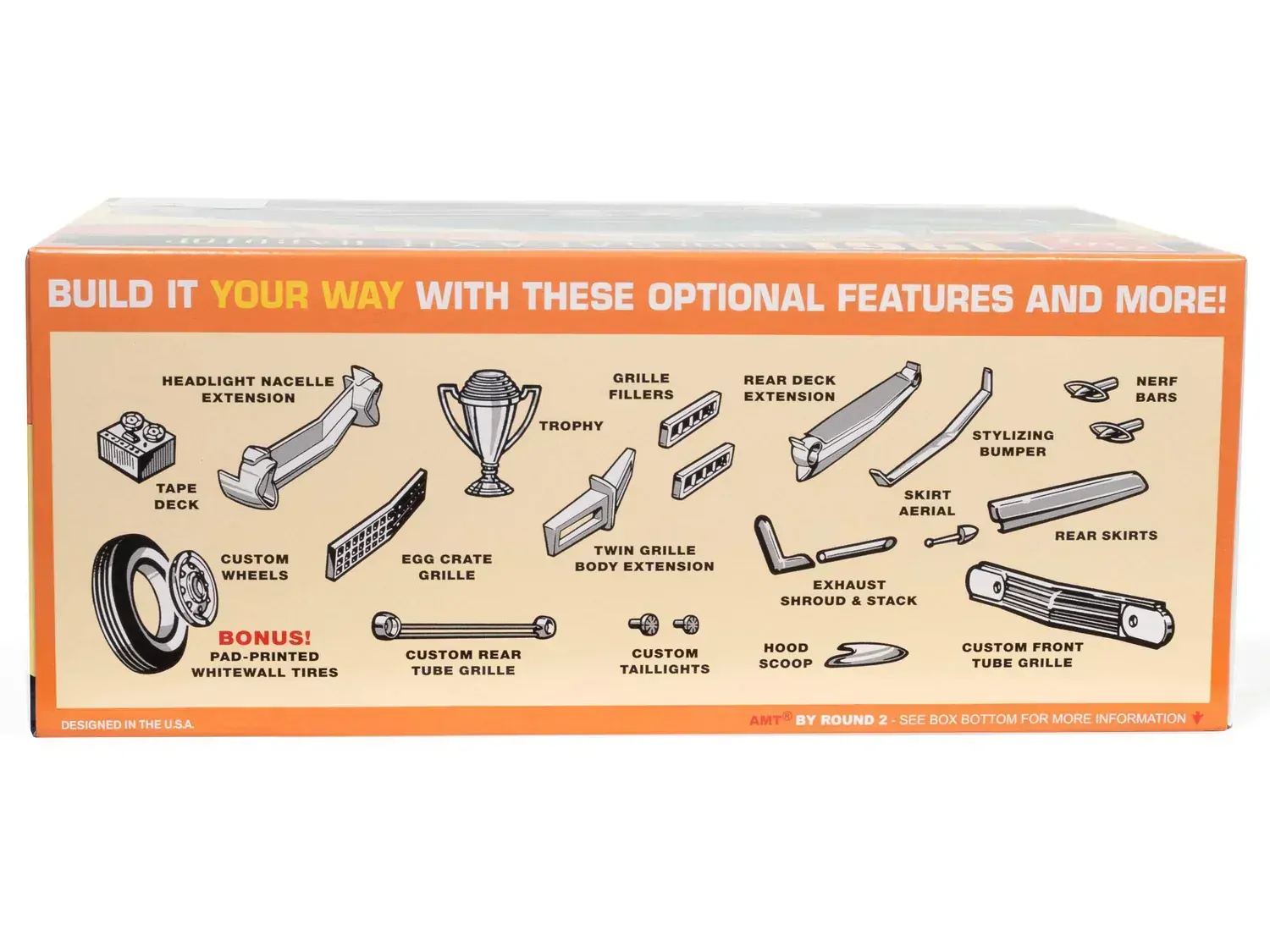 This curbside kit will be sure to please with its advanced styling and customization options. There are plenty of optional features including an egg crate grille, a custom front tube grille, grille fillers, a headlight nacelle extension, a twin grille body extension, a hood scoop, rear skirts, and more. The kit also includes BONUS pad-printed whitewall tires with custom wheels. There is also an ALL-NEW colorful decal sheet with plenty of options and is all wrapped up in AMT s vintage-style packaging.