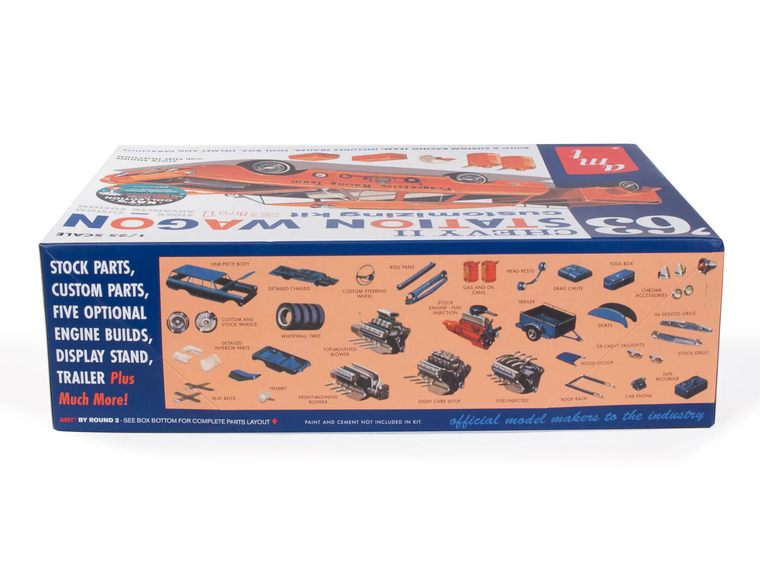 Options galore: the 1963 chevy ii station wagon customizing kit is loaded with options! Fully paintable, the model kit can be built as a stock, custom or advanced custom wagon. Features include: new tooling, pull-behind trailer, 5 engine options, engine display stand, whitewall tires, custom and stock chrome wheels, racing accessories, and a new water-slide decal sheet loaded with colorful options all wrapped up in eye-popping, vintage-style packaging