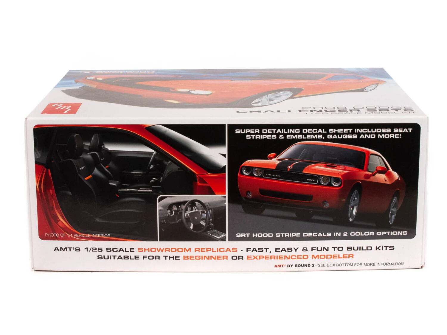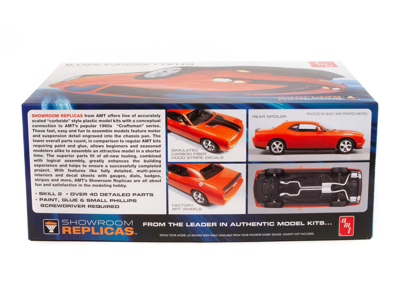 AMT s Showroom Replicas ¢ Series offer modelers a simplified, promo-style glue kit format with a reduced parts count for fast and easy assembly. Engine detail is engraved into the one-piece chassis pan, allowing novice and veteran builders to complete an attractive scale replica in record time. Back for another cruise to the drive-in is Dodge s immensely popular and powerful 2008 Challenger SRT8. It comes complete with chrome wheels, vinyl seats and a decal sheet full of authentic markings!