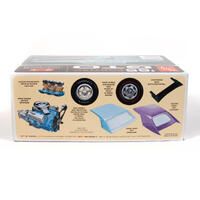 Quick specs: 1/25 scale, 90 parts, 8 inches long once assembled. Parts molded in white, transparent red and clear, with black vinyl tires. Some parts are chrome plated. Paint and glue required. Paint guide included in kit. For ages 10+