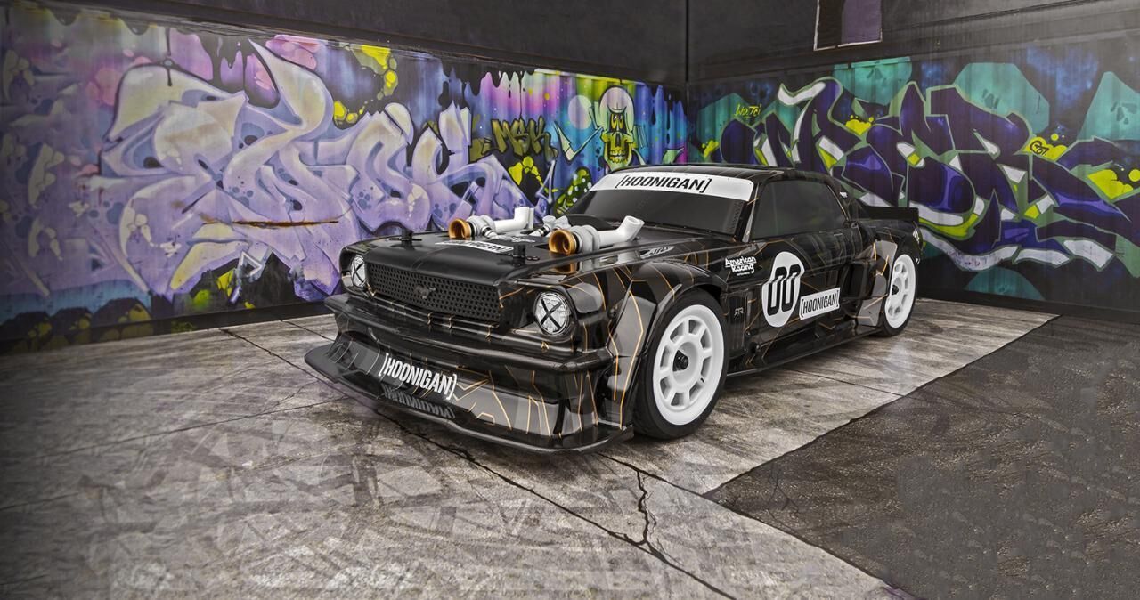 the engineers at team associated spent countless hours capturing many of the details synonymous with the 1965 ford mustang hoonigan hoonicorn. Features including officially licensed american racing vf503 wheels, rear diffuser, molded intake and turbos, scale brake rotors, and more!