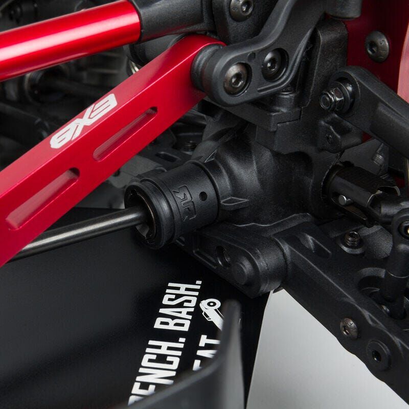 The tough-as-nails anodized aluminium chassis has been reinforced with aluminium front and rear chassis braces and a tower-to-tower centre brace for maximum durability. Bumpers and nerf bars supply impact protection on all sides. Thanks to an independent suspension with bump-soaking oil-filled shocks, the truck handles equally well over wicked or well-travelled tracks.