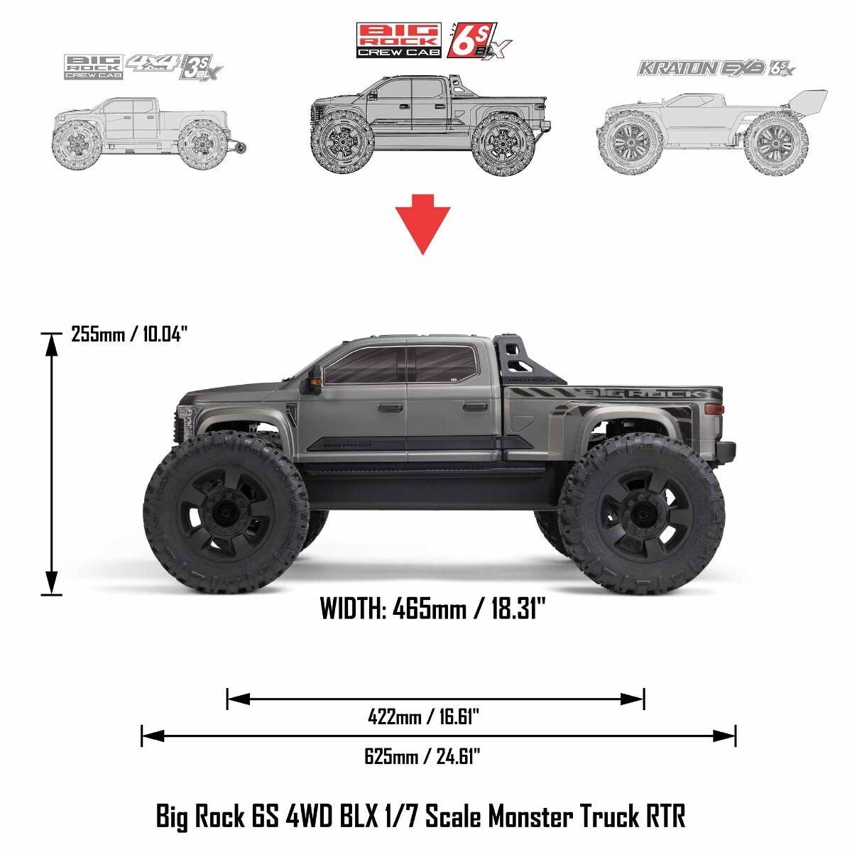 Built on the proven 6S BLX platform and supersized to 1/7 scale, the ready-to-run BIG ROCK 6S BLX 4x4 blasts like only a large-scale ARRMA RC monster truck can especially when amped up with Spektrum brushless power and topped with an eye-catching crew cab body. Featuring loads of realistic scale details and "stealth" black-anodized aluminum parts, the ARRMA BIG ROCK 6S BLX is big, fierce, fast, and tough.