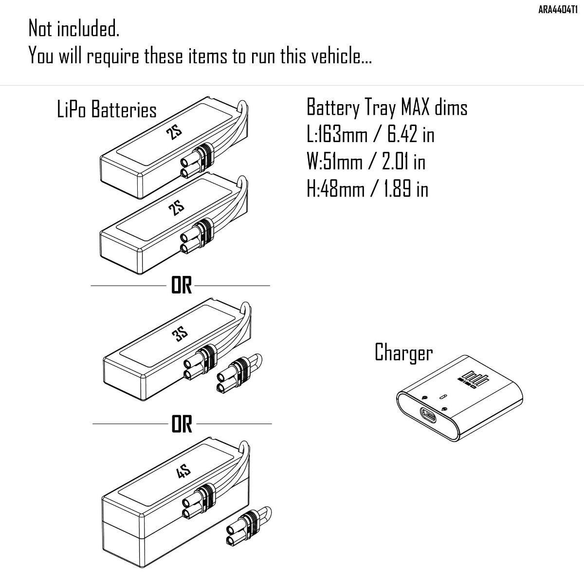 A LiPo battery pack and charger are all that you ll need to complete the 1/8 scale ARRMA MOJAVE 4S BLX 4X4. Pop in a charged pack and prepare for amplified, all-road ARRMA blasting, desert truck style!