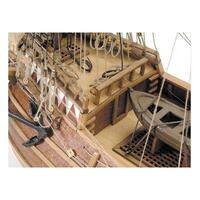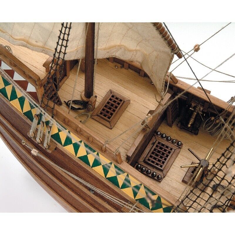 The modeling kit comprises high precision laser cut board, wood, brass, cast iron and fabric. Also includes cut and hand-sewn cotton sails ready to be placed.