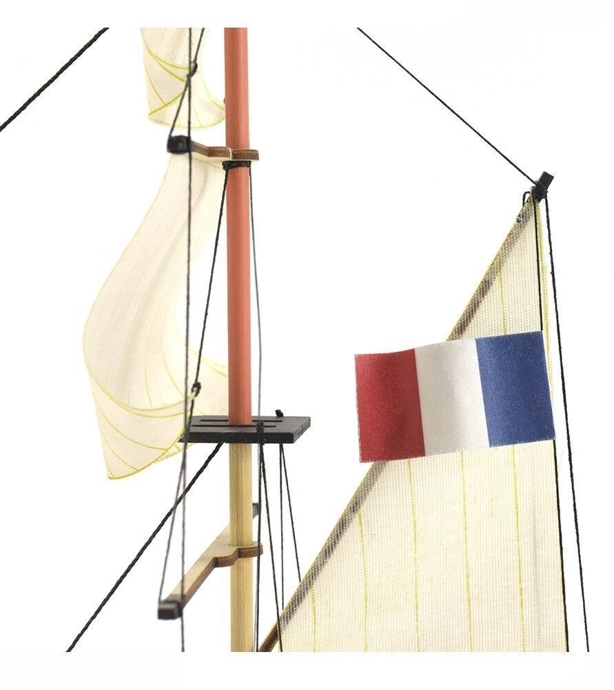 The box of Hermione La Fayette includes all the necessary parts to build the model, a total of 120. There are new parts cut by high-precision laser that allow an extraordinary fit, thus facilitating the assembly process. In addition, it contains printed sails, threads, lifeboat, cannons, flag, stickers, glue, paints and brush.