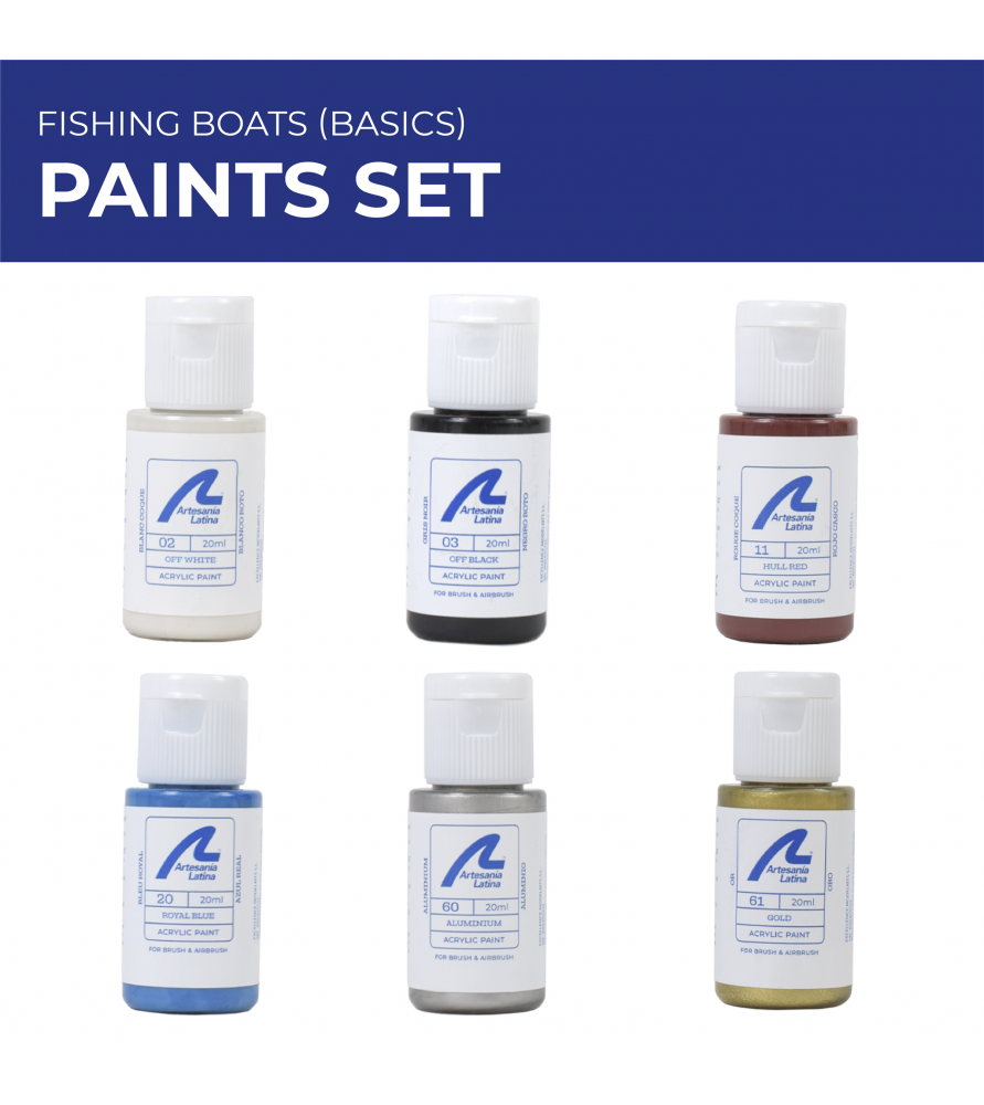 The basic set of water-based paints for fishing boat models consists of 6 jars of different paints, each one with 20 ml of product. In this sense, it includes the following colors in paints: off white, off black, hull red, royal blue, aluminum and gold
