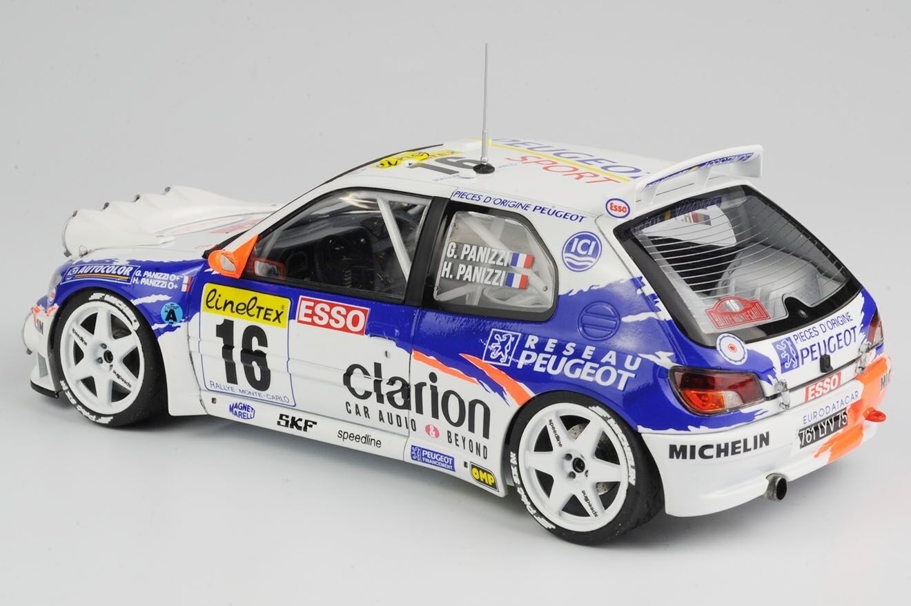 The model is a 1/24th scale plastic model kit of the Peugeot 306MAXI Evolution Model EVO2. The overall length and width of the finished model is approximately 166mm and 75mm, respectively. The unique form of the EVO2, including the front fenders, is well represented with the addition of new parts. Fog lamps are set on the front using a new mold.