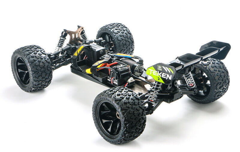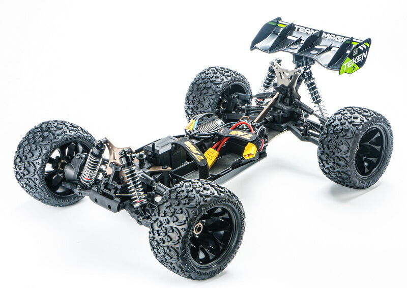 The all-wheel drive TEKEN truggy from Team Magic in 1:8 XL scale is powered by a 100A waterproof electronic speed controller in combination with a 2500 KV high-speed motor. A 16 kg metal gear servo provides the most powerful steering control. All electronic components are waterproof (splash-proof). The base plate is made of 3 mm thick, ultra-light aluminum. It includes three differential gears equipped with CNC-machined bevel gears to absorb the forces and ensure perfect power distribution for each wheel. This includes aluminum shock towers and aluminum shock absorbers. Chassis stiffeners reduce unwanted twisting of the chassis while driving. Wheelbase, camber and caster can be fully adjusted with threaded rods. High-performance tires offer better traction control and a longer service life. The body of the TEKEN truggy is made of robust Lexan (polycarbonate) and perfectly matched with a big high down force rear wing that helps vehicle keeps stable jumping high in the air.