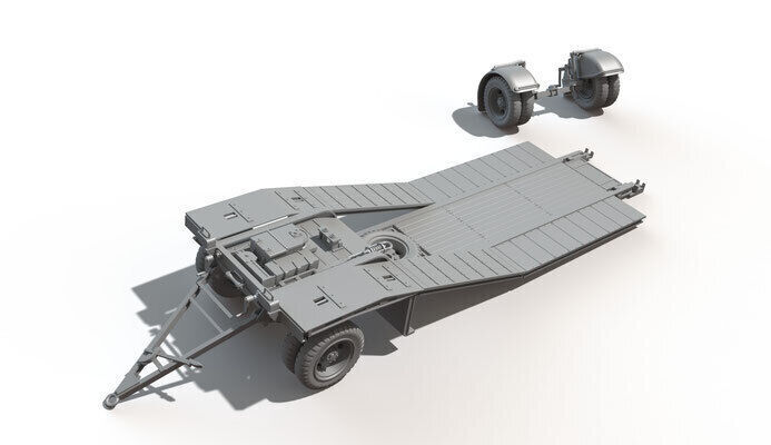 The front tow-bar is moveable, the front axle can be rotated, the upper ramps can be re-posi-tioned to the rear of the vehicle in a loading configuration (or the small, alternate ramps can be used and the forward ramps can be left in place, as is seen in some photos), the lower for-ward ramps can be installed in the stowed or raised configurations, and the rear axle can be left off in the loading configuration.