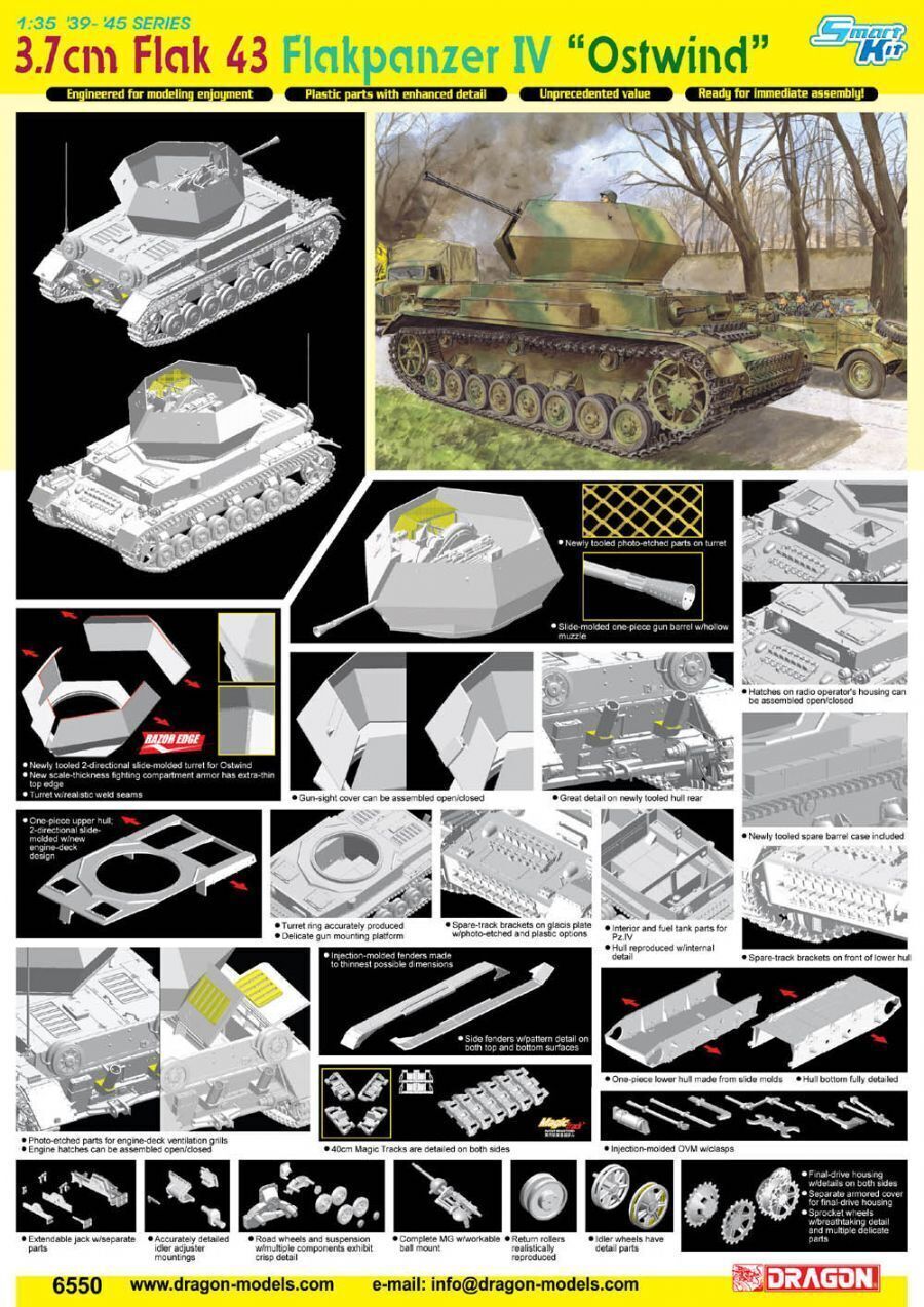 Dragon's Ostwind kit is fantastically detailed. To be most useful to modelers, this kit represents a standard-production model. The hexagonal turret, called a "cookie tin" by German soldiers, is made by two-directional slide molds and features the correct scale thickness thanks to Dragon's Razor Edge technology. The turret also bears true-to-scale weld seams. The one-piece FlaK 43 gun with hollow muzzle is finely detailed and is produced by slide mold. The track links are 40cm Magic Tracks, specially designed for easy assembly and they come with full detail. Finesse is added with photo-etched components like engine-deck ventilation grills. This kit uses Dragon s phenomenally detailed Panzer IV kits as a suitable platform to show its true artistry. Whether displayed by itself or in an action-packed diorama, this high-aiming Ostwind will grab a lot of attention!