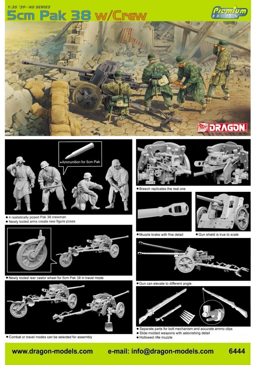 The 5cm PaK 38 antitank gun was developed by Rheinmetall-Borsig AG in 1938 as the successor to the 37mm PaK 36. Entering service in December 1940, one of its first duties was to attack Soviet tanks when Operation Barbarossa kicked off in June 1941. Indeed, at that time the 5cm L/60 gun of the PaK 38 was one of the few weapons able to defeat the 45mm-thick sloped armor of the Soviet Union s formidable T-34 tank. The development of a Panzergranate 40 projectile with a tungsten core further enhanced its antitank properties. Weighing 830kg, the gun had a height of just 1.05m. A well-trained crew of five could achieve a rate of fire of 13 rounds per minute. Dragon will release a fine 1/35 scale Premium Edition model of the 5cm PaK 38 antitank gun.