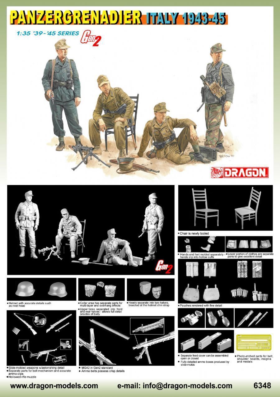 Dragon s fine new set of german panzergrenadiers poignantly depicts four men involved in this protracted fighting. The 1/35 scale set will have broad appeal, the mix of uniforms and personal equipment allowing modelers to portray soldiers anywhere within the 1943-45 timeframe. They are wearing a wide variety of warm-weather uniforms commonly seen in italy, including the cotton herringbone twill (hbt) uniform. This alone makes them very valuable to figure modelers, but they have other advantages too. Each figure is shown in a casual pose, perhaps reflecting their exhaustion from the constant fighting. One of the figures is resting his weary frame on a chair, the latter being delightfully crafted and included in the set. All figures come with an option of two heads so that either a cap or a steel helmet can be worn. It was soldiers such as these panzergrenadiers who managed to hold up the allies in italy until april 1945, and this new dragon figure set captures their look beautifully