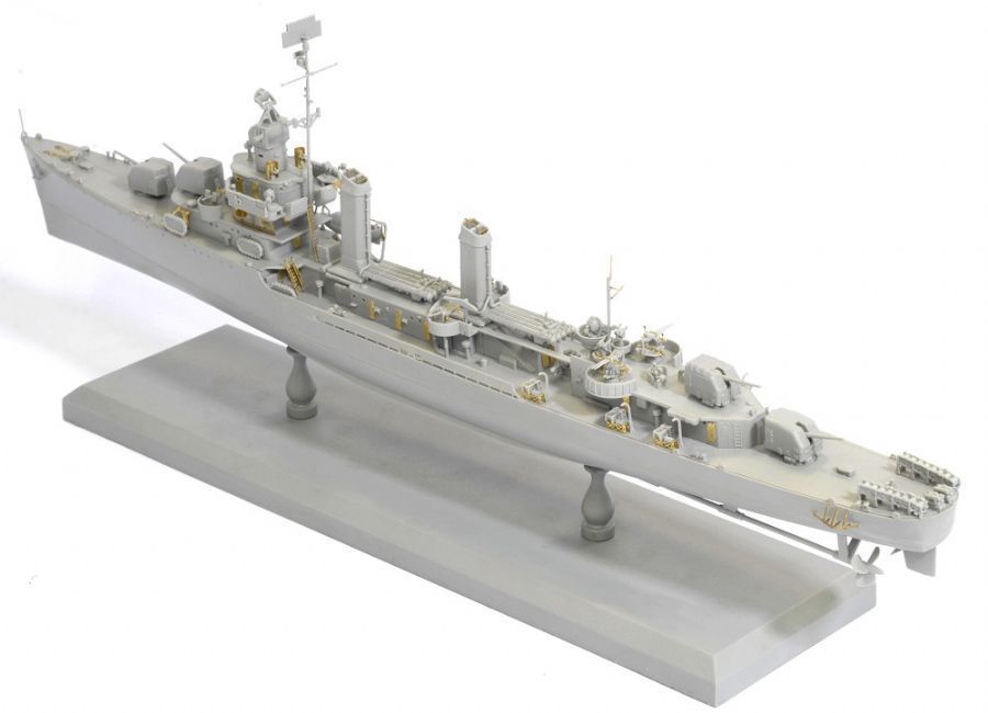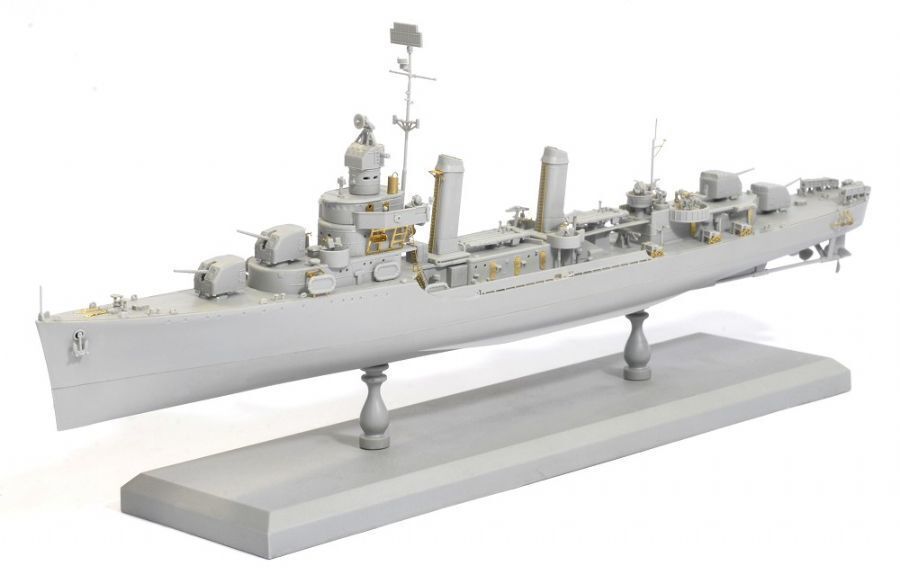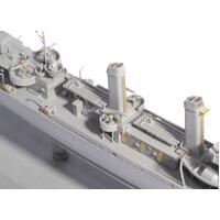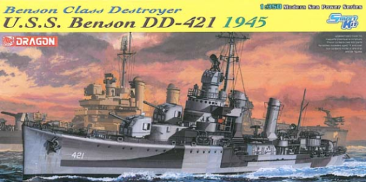 The USS Benson now appears in Dragon...s 1/350 Sea Power series as a plastic kit. The kit depicts the destroyer as it appeared in 1945 towards the close of the war. As such it features a brand new aft deckhouse and a new director radar dish. Unlike other vessels in the Benson class, it also possesses a second torpedo launcher. The kit is finely detailed thanks to photo-etched elements to render items like antennas, ladders, antiaircraft guns and propeller guards. Some door hatches are even provided as optional parts so that modelers can portray open doors! There are other accessories like half a dozen scale crewmen to populate the deck, as well as Dragon...s novel, flexible self-adhesive signal flags. This 1/350 scale kit of the USS Benson is brimming with detail, and it is a worthy depiction of a ship that had a distinguished wartime career.