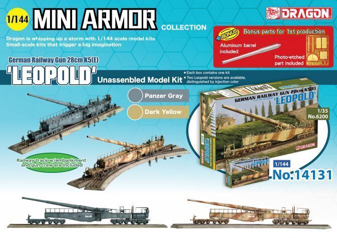 Dragon has previously released an enormous 1/35 scale kit of leopold', but its size probably precluded many from even beginning any attempt at building it. Dragon now has the ideal solution in the form of its mini armor collection, with a convenient 1/144 scale kit of the german 28cm k5(e). This scale is much more manageable, plus the finished product will not take up nearly as much shelf space! this kit has everything needed to form a stunning diorama straight from the box, for the set includes a section of railway track and embankment for the railway gun to sit on. Not only that, but dragon also includes artillery crewmen to populate the gun and surrounding diorama. And the most amazing thing about this mini armor item? there are actually two different and complete k5(e) railway guns on offer: one is finished in plastic that is german panzer gray, and the other in dark yellow. That means modelers can choose the one best suited to the diorama they have in mind, either in an italian theater or somewhere elsewhere in europe. Leopold' lives again it's still big but it's much more conveniently sized than before!"