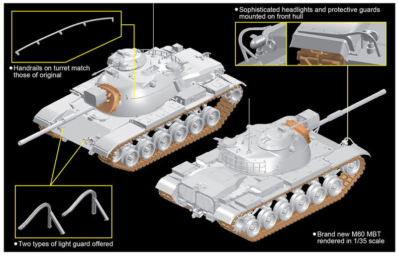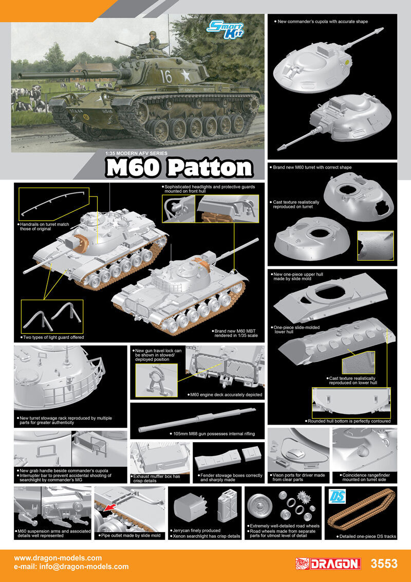 Dragon is going down an exciting avenue by offering its first M60 main battle tank (MBT) in its 1/35 scale range of modern fighting vehicle kits. The M60 family of tanks was to become the USA...s primary MBT during the Cold War after its introduction into military service in 1960. Fitted with a bore-evacuated 105mm M68 main gun, it was an improved successor to the incumbent M48, which boasted only a 90mm gun. The M60 series went on to serve for more than four decades with the USA, and it still remains operational with a number of foreign purchasers.