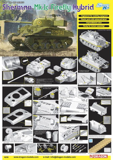 The Firefly was a stroke of genius on the part of British tank designers, combining a more potent high-velocity antitank gun with the tried and tested Sherman design. The gun fitted in the turret was the British Ordnance Quick Firing 17 pounder, able to take on even Germany s most heavily armored vehicles like the Tiger I and Panther. Three different Firefly variants were produced: Ic, Ic Hybrid and Vc. Dragon s newest 1/35 scale Smart Kit portrays a Firefly Ic Hybrid, this nomenclature denoting a vehicle based on a composite hull. Such vehicles combined the front portion of a cast hull with the rear section of a welded hull. Production of the Firefly began in early 1944 and 342 had been delivered for use in the D-Day landings. Overall production was in the order of approximately 2200, and they served in both Northwest Europe and Italy.