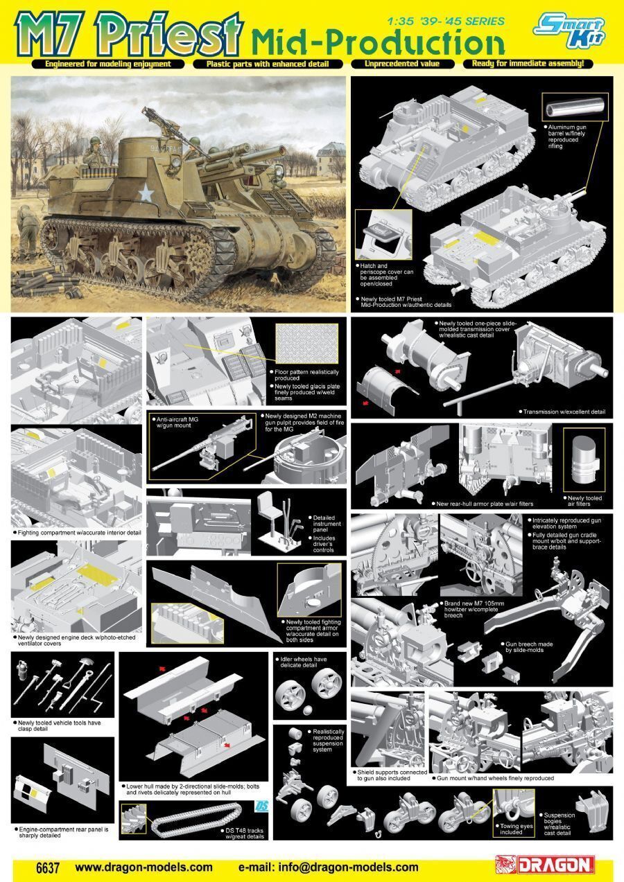 Dragon has served fans of german self-propelled howitzers well, and now it's the turn of allied proponents to add artillery pieces to their collections! In fact, this new kit of a mid-production variant of the m7 priest is something of a milestone since it is dragon's first ever open-topped allied afv with interior detail. This obviously required completely new designs and tooling for the upper hull and fighting compartment. All the necessary details such as ammo storage are present in the fighting compartment, which itself features finely honed walls to give a true-to-scale thickness to the upper-hull armor plates. The gun is highly detailed and is based on the successful towed 105mm howitzer previously released by dragon. Interestingly, the lower hull is also a brand new tooling, having nothing in common with existing sherman kits in dragon's range. When combined with the existing high standard of sherman tracks and running gear, this m7 priest is most definitely the most accurate version of this artillery piece available on the market. "