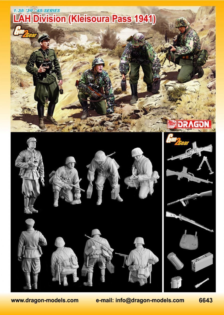 Dragon. S newest 1/35 scale figure set depicts four german soldiers from the elite lssah regiment as they fight in the rugged terrain near kleisoura pass. The quartet includes a commander. A depiction of none other than kurt meyer. And three of his soldiers. At that time, major meyer was commander of the reconnaissance battalion, and he personally led one of the attacks at dawn on 14 april. For this and subsequent actions, meyer was awarded the knight. S cross. It. S said at one stage he threw a grenade into the midst of his troops to ensure the attack kept rolling. The four plastic figures are brand new and they come with a variety of weapons such as the czech-built zb vz. 26 (zb-26) machine gun and erma emp-35 submachine gun. The troops are wearing camouflage smocks. As they conduct their assault. They. Re sharply sculpted in realistic poses, and modelers are certain to find a great many uses for them in dioramas