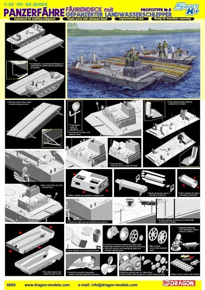Dragon has created an impressive 1/35 scale plastic kit of the second prototype of the panzerfa"hre. This means it's a perfect companion to the previously announced prototype nr. I (item no. 6625). What makes this kit spectacular is the inclusion of the pontoon ferry as well as the lws tractor. When prototypes nr. I and ii are joined together, they'll make a complete panzer ferry. This lws has many different parts compared to the first kit a couple of examples include the driver's compartment and the absence of the two air intakes. Clever use of slide molds means this vehicle is easier to assemble. The panzerfa"hre deck is accurately produced with fine details, as is the pontoon. Hatches in the deck can even be displayed open or closed. Modelers can produce an amazing scene with the arrival of this new kit it's time for modelers to burn their bridges behind them!"
