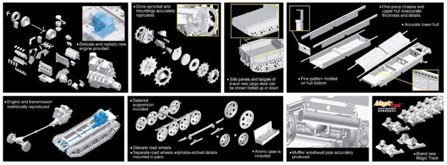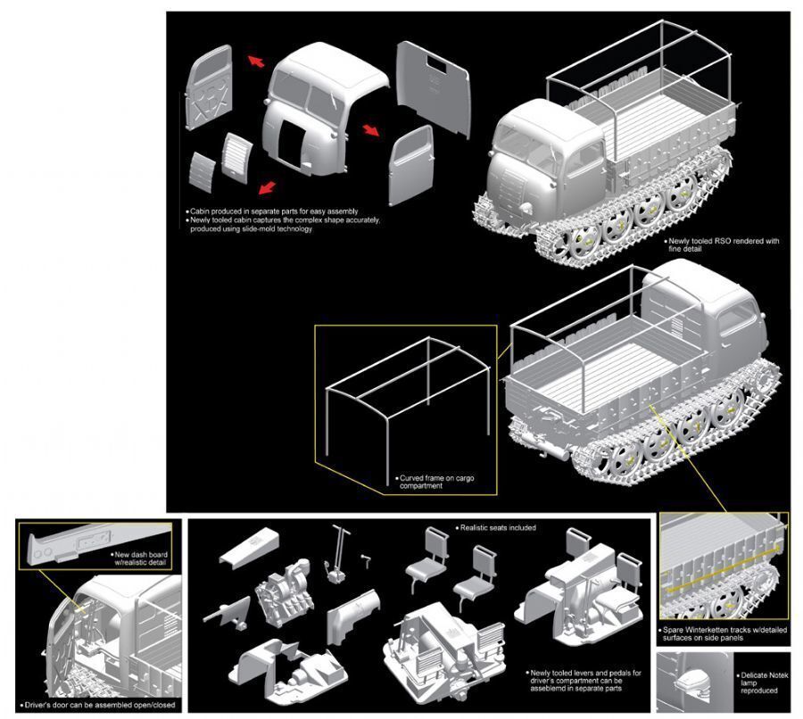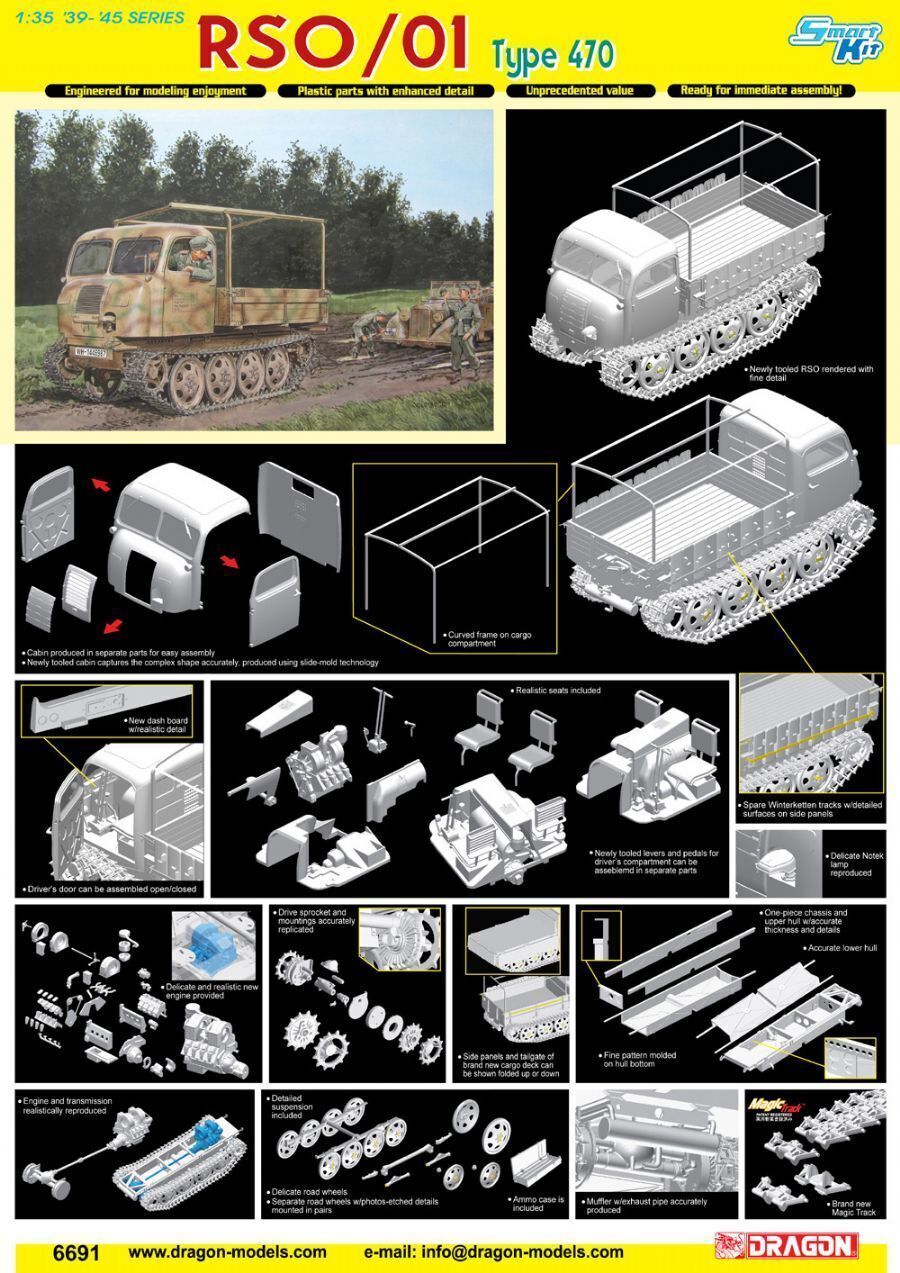 Dragons new 1/35 scale model depicts the standard RSO/01, this type with rounded steel cab being the best known of all the versions used by Germany. Indeed, the complex shape of the cab was created by a Japanese model-maker, and it is easily the most accurate cab available on the market today. The cab is a sophisticated piece of molding in terms of detail and measurements, with all the curves accurately reproduced in miniature. Many modelers have been waiting a long time for Dragon to produce this iconic version of the RSO, and they wont be disappointed with this new kit. For those wishing to create a dynamic Eastern Front diorama scene, this RSO tractor will prove irresistible!