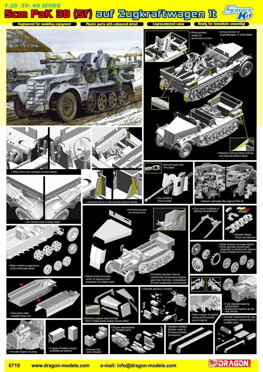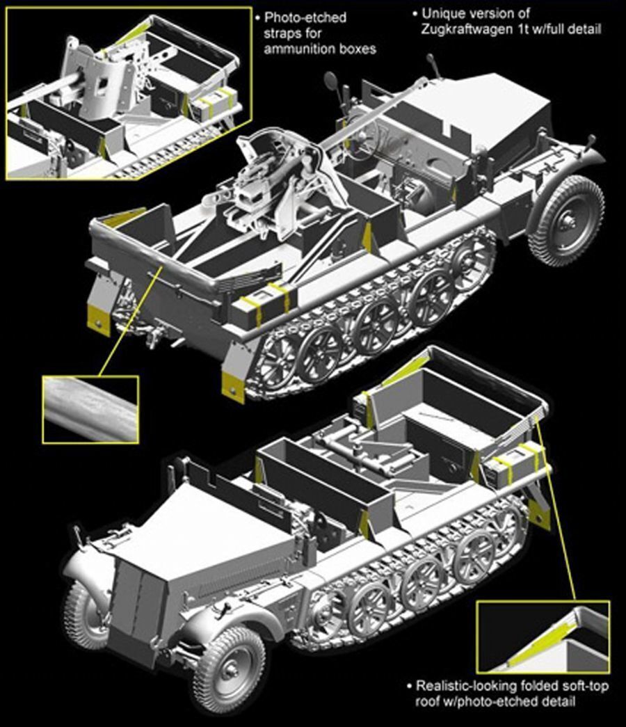 Dragon has already produced several 1/35 scale 1-ton sd. Kfz. 10 halftracks in plastic and these have been gladly received by modelers. This new kit from dragon is the most potent version yet, thanks to the inclusion of the 5cm cannon. Indeed, this kit is an excellent hybrid that mates the delightful sd. Kfz. 10 halftrack with dragon. S legendary 5cm pak 38 anti-tank gun. The entire gun mount is completely new to suit this vehicle, plus the halftrack interior has been modified accordingly. The folded hoops for the roof are also brand new. The kit includes three armor elements for the hood, grill and windshield to perfectly recreate original vehicles. This is a spectacular halftrack with lots of firepower, and it. S certainly a welcome addition to the sd. Kfz. 10 family