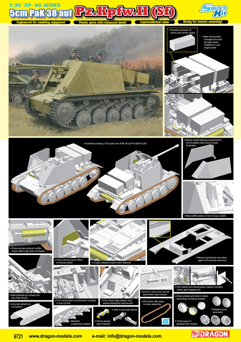 this 1/35 scale kit has many great new parts to completely represent this tank conversion. For example, the upper hull is new. The appearance of the self-propelled tank destroyer is captured perfectly in miniature, including the new armor panels of the superstructure that are made true to scale. Also new is the gun mount for the 5cm weapon. Large ammunition bin and stowage bin are correctly installed on the engine deck. If a modeler wanted to create this unique and interesting german vehicle, they had to do so from scratch by combining assemblies from several different plastic kits. Now dragon has done all the work for modelers, creating numerous original parts in the process, and a 5cm pak38 auf pz. Kpfw. Ii can be built accurately straight from the box!
