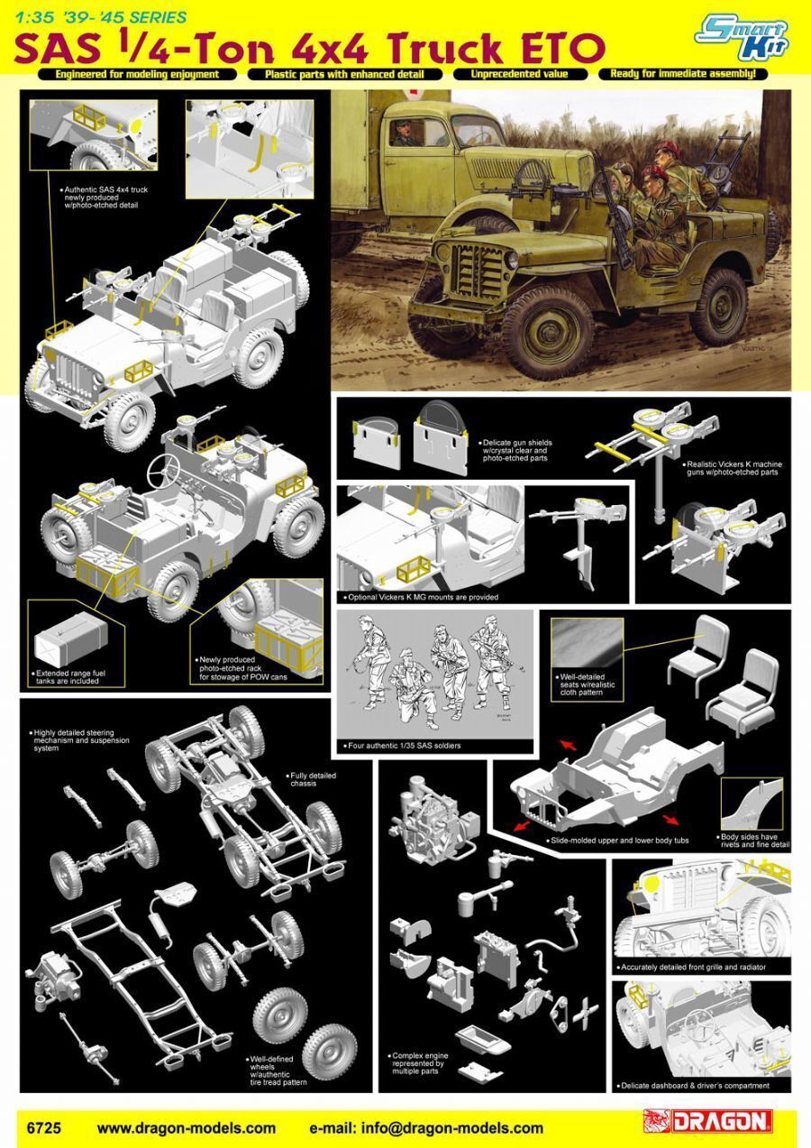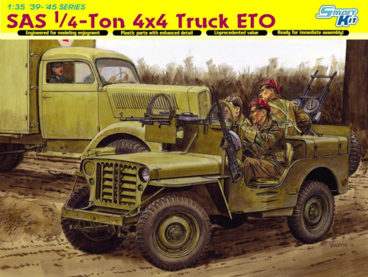 Modelers and collectors were delighted when dragon released a 1/35 scale model of a 1/4-ton 4x4 truck as used by the special air service (sas) in north africa. The kit offered intricate detail and pleasurable assembly. Now dragon is proud to announce a follow-up sas vehicle kit in the same scale, this time featuring a vehicle operating in the european theater of operations (eto). The sas, formed in july 1941 by david stirling, was a commando force designed to operate deep behind enemy lines, something it did very successfully in north africa, italy and northwest europe. In fact, in europe the small band of sas members inflicted 7,733 german casualties, captured 4,784 prisoners, destroyed 700 vehicles and cut 164 railway lines