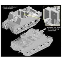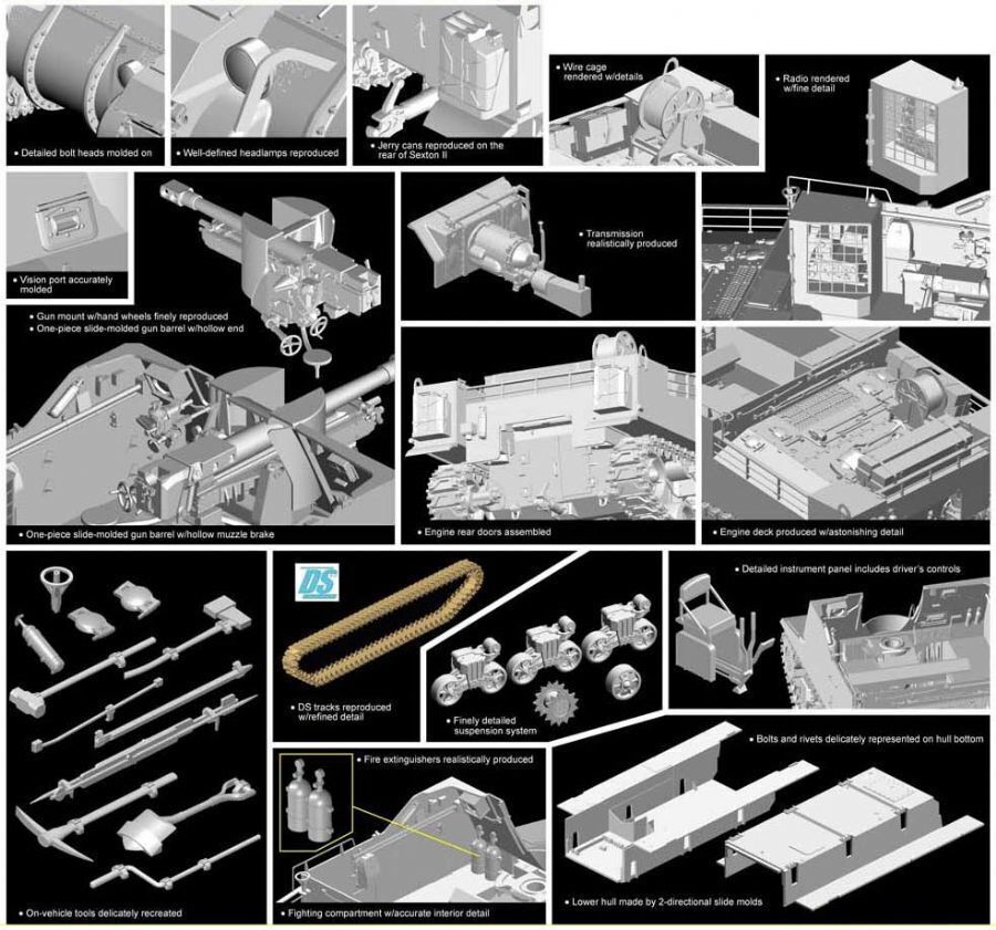 Dragons kit of the Sexton II, while it bears a striking similarity to the M7 Priest, is most definitely a brand new kit. It features a brand new fighting compartment, new armor plates, a new engine deck and an all-new interior. Obviously, the design team went right back to basics to create this kit. The main armament makes use of the 25-pdr Field Gun kit that Dragon introduced before, although even this had to be modified to allow for the special mount that allowed its installation. The muzzle brake is made from scratch too. Furthermore, the chassis is starkly different to that used on the Priest. Meanwhile, the bogies and road wheels stem from the high-quality Sherman kits that Dragon is renowned for. Indeed, this new Dragon Sexton II is an answer to many a modelers prayers!