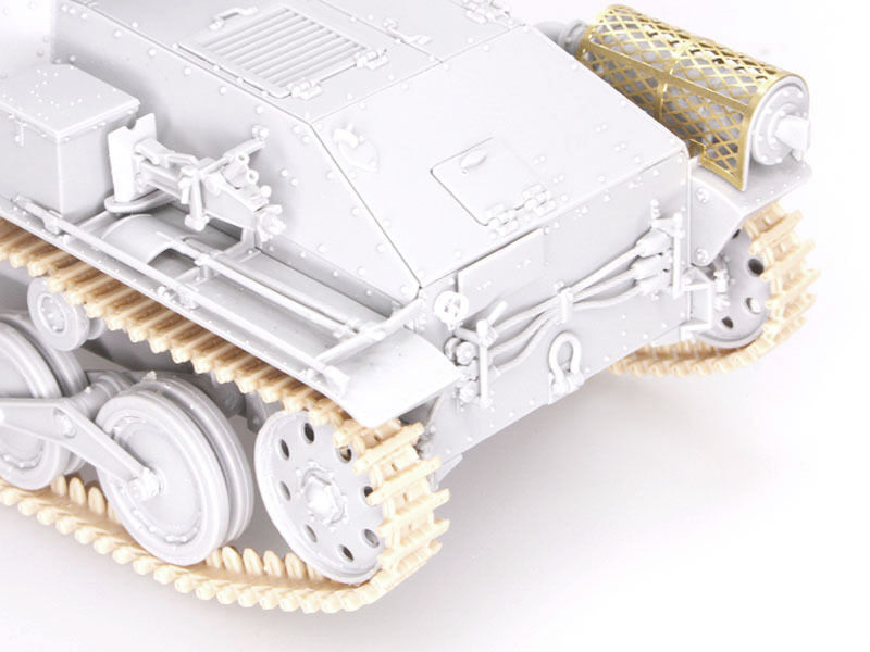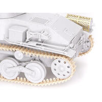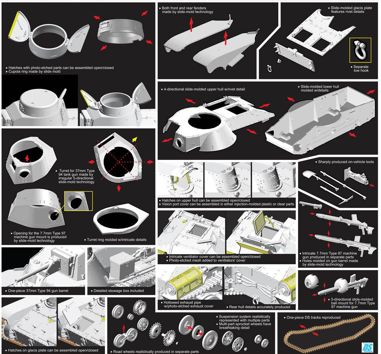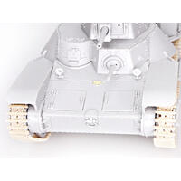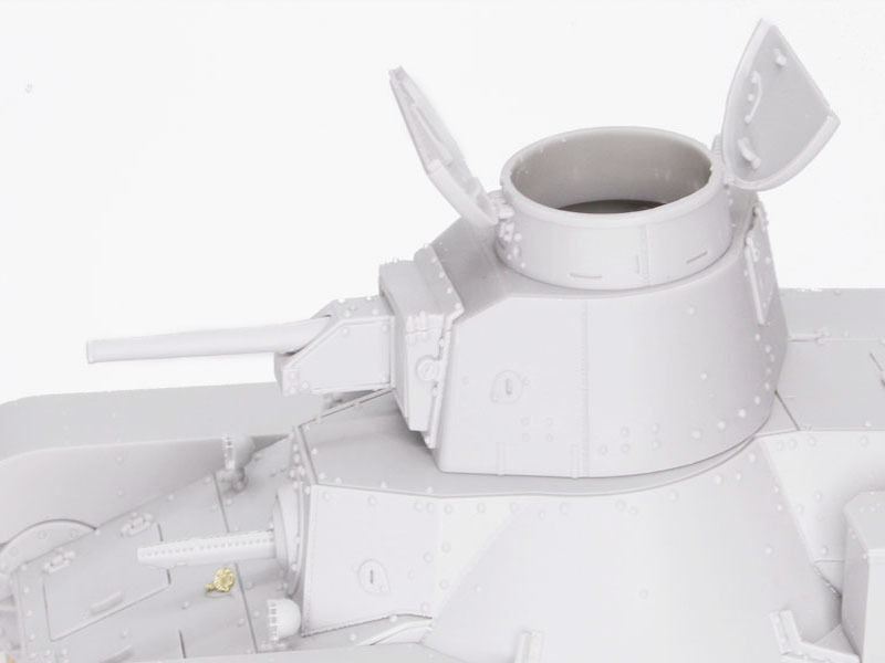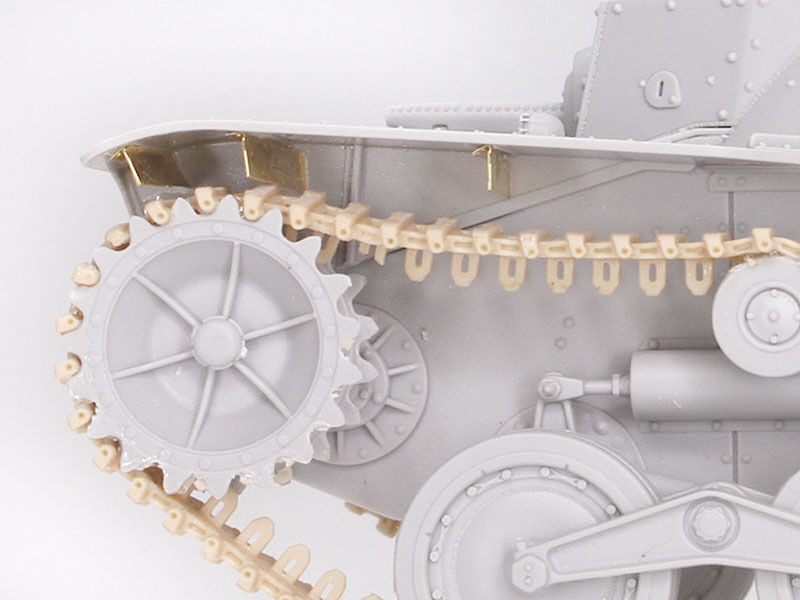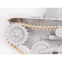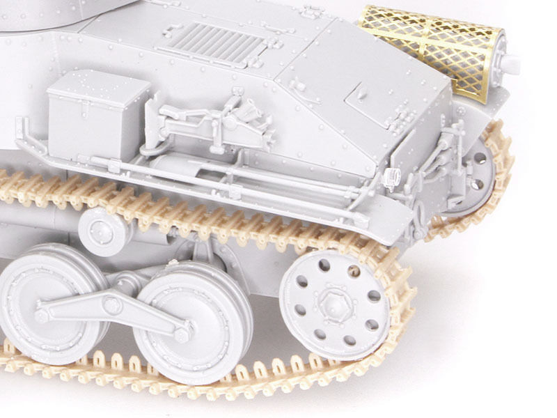 The kit has received many new parts so it can accurately depict a Late-Production ...Ha-Go... They include a new cupola on the turret, and rounded front fenders (the Early-Production type...s fenders were flat and squarely cut off). The frontal armor and glacis plate are suitably modified too, plus the towing hook on the front is new. Meanwhile, the turret and one-piece upper hull and lower hull remain unchanged. They...re still brimming with detail thanks to the widespread use of slide molds. In fact, every single sprue in the kit employs slide molds, which is an astounding achievement! The road wheels, idlers, sprockets and return rollers are slide-molded, whilst the DS slide-molded track links are accurately replicated in miniature so as to incorporate side details. The ...Ha-Go.. was used in diverse battlefield locations, so modelers can really go to town by producing any scenario such as jungle-clad terrain or a Pacific tropical island!