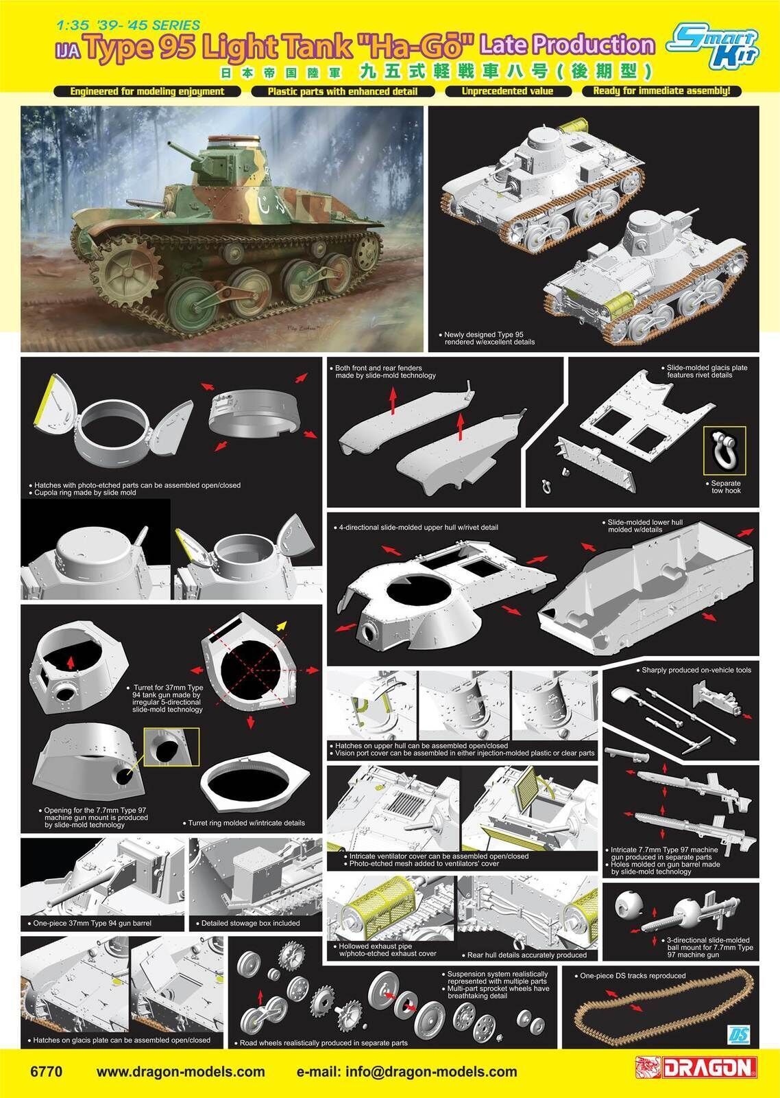 When Dragon introduced its new 1/35 scale gem of a Type 95 ...Ha-Go.. light tank of the Imperial Japanese Army (IJA), it garnered great excitement in the modeling fraternity in 2012. Based on actual measurements from surviving tanks, that particular kit (Item No.6767) represented an Early-Production variant of this small tank. Now Dragon has released another Type 95 plastic kit, this time depicting one with Late-Production features. The Type 95 tank was used in combat against China and Russia, as well as fully participating in Japanese operations in WWII. Weighing just 7.4 tonnes, it was designed primarily as an infantry support weapon. Indeed, it was the most common light tank used by the IJA in the Pacific, with about 2,300 units manufactured by Mitsubishi Heavy Industries. It had a crew of three, and the main armament was a Type 94 37mm gun. Its maximum speed was 45km/h.