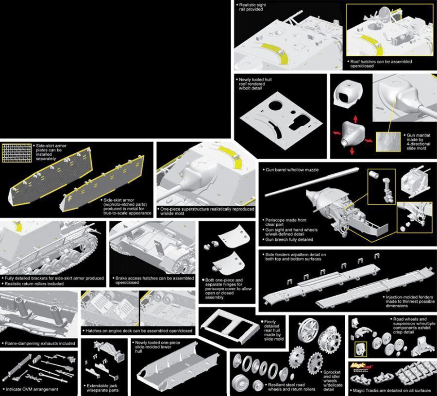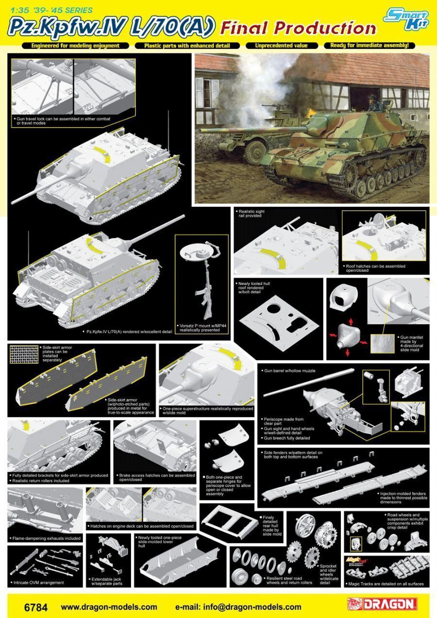 Dragon has created another 1/35 scale version of this important tank destroyer. Its based on Item No.6689, itself based on Dragons Panzer IV Smart Kit family. This newest Pz.Kpfw.IV/70(A) family member is a Late-Production type, and the major difference is that it possesses a modified hull derived from a later-production series of the Panzer IV. The suspension features three return rollers per side, plus there are other detail differences appropriate to a Late-Production vehicle. As a Smart Kit, theres a one-piece lower hull, convenient Magic Tracks and the fighting compartment is made by slide molds so no multipart assembly is necessary. There are Schurzen side skirts and of special interest is the mounted MP44 Vorsatz P, a weapon with a curved barrel to protect blind-spots not covered by the mounted MG42 machine gun. The gun breech is fully represented, and it can be viewed through the open roof hatches. Welcome to the new family addition