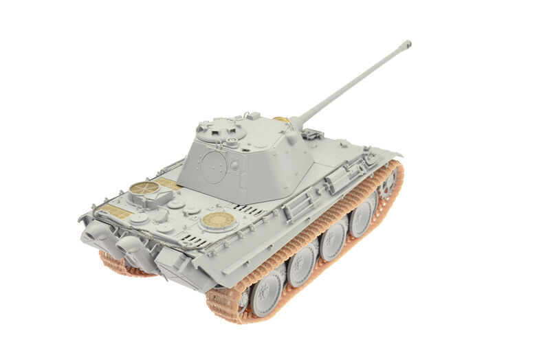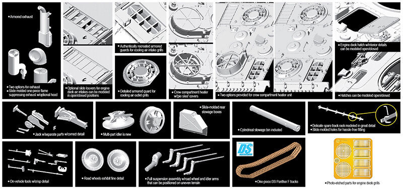 The german panther was one of the best tanks to see service in wwii. Designed from the outset to regain combat superiority over soviet tanks like the t-34 on the eastern front, it represented an ideal balance of firepower, mobility and protection. The next-generation panther was to be the ausf. F, whose design was approved in may 1944. The basic concept was a more heavily armored tank with a new schmalturm turret mounting a 7. 5cm cannon. Production of the ausf. F with the schmalturm was supposed to begin in 1945, but the deteriorating war situation put paid to that possibility. However, of interest to this particular dragon kit is an associated panther ausf. F version fitted with a 7. 5cm kwk l/100 gun. This tank looks most formidable with its enormously long gun barrel capped by a muzzle brake. Certainly, the panther ausf. F with 7. 5cm kwk. 42 l/100 would have been a lethal weapon had production commenced