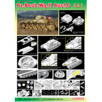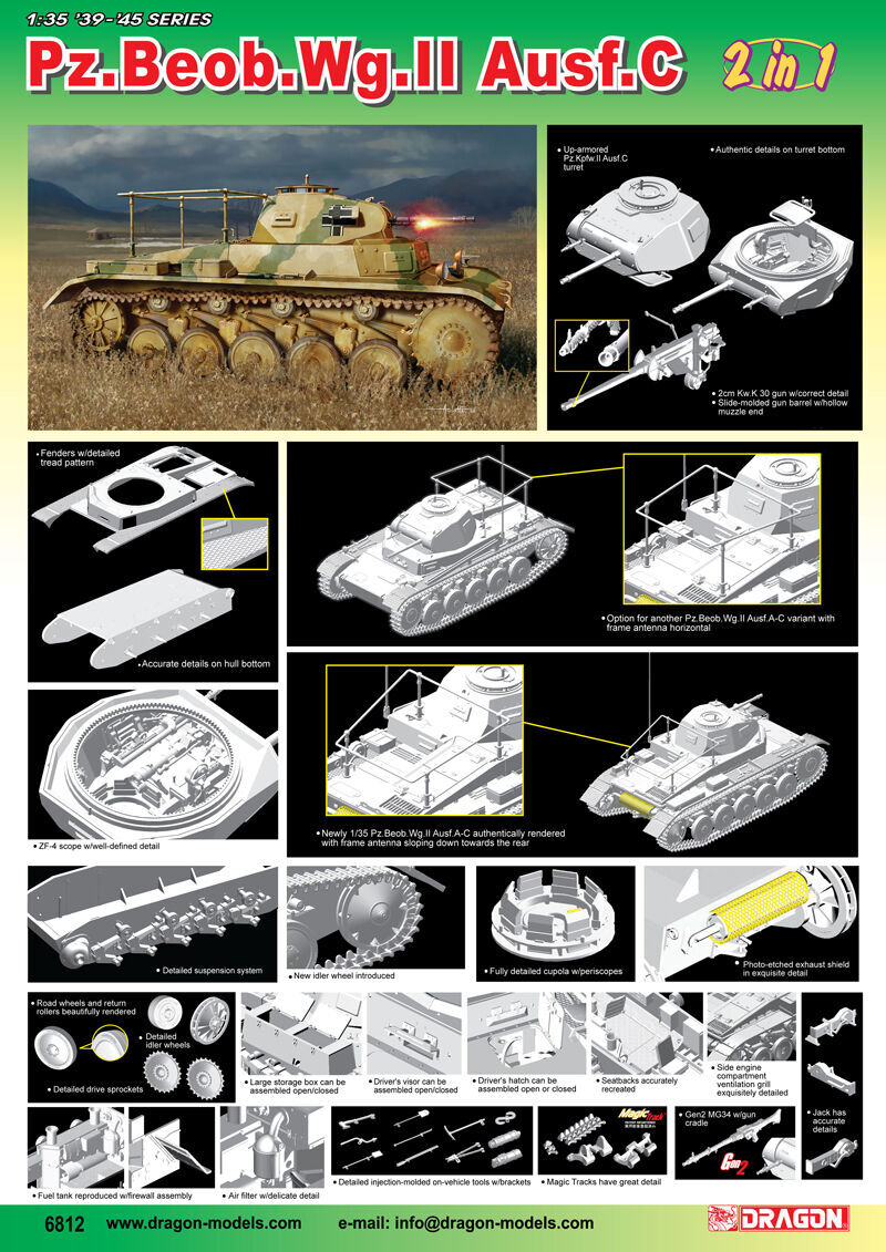 dragons panzer ii family has now admitted a new 1/35 scale kit of such a pz. Beob. Wg. Ii. For extreme versatility, the model features all the necessary elements to create such an artillery observation vehicle. This kit may be small, but its simply exploding with fine detail. Of course, the distinctive frame antenna is brand new. Furthermore, the 2cm cannon is slide molded and possesses a hollow muzzle. For added convenience, the kit comes with magic tracks. This kit provides everything you need to create an accurate panzer ii ausf. A-c artillery observation tank. Its observably a brilliant kit!