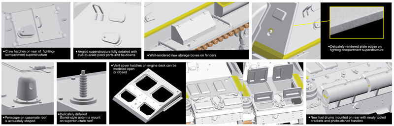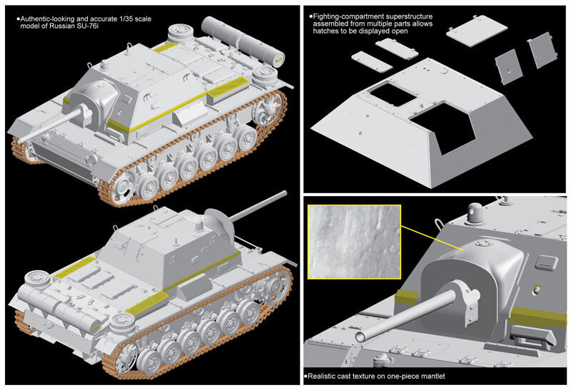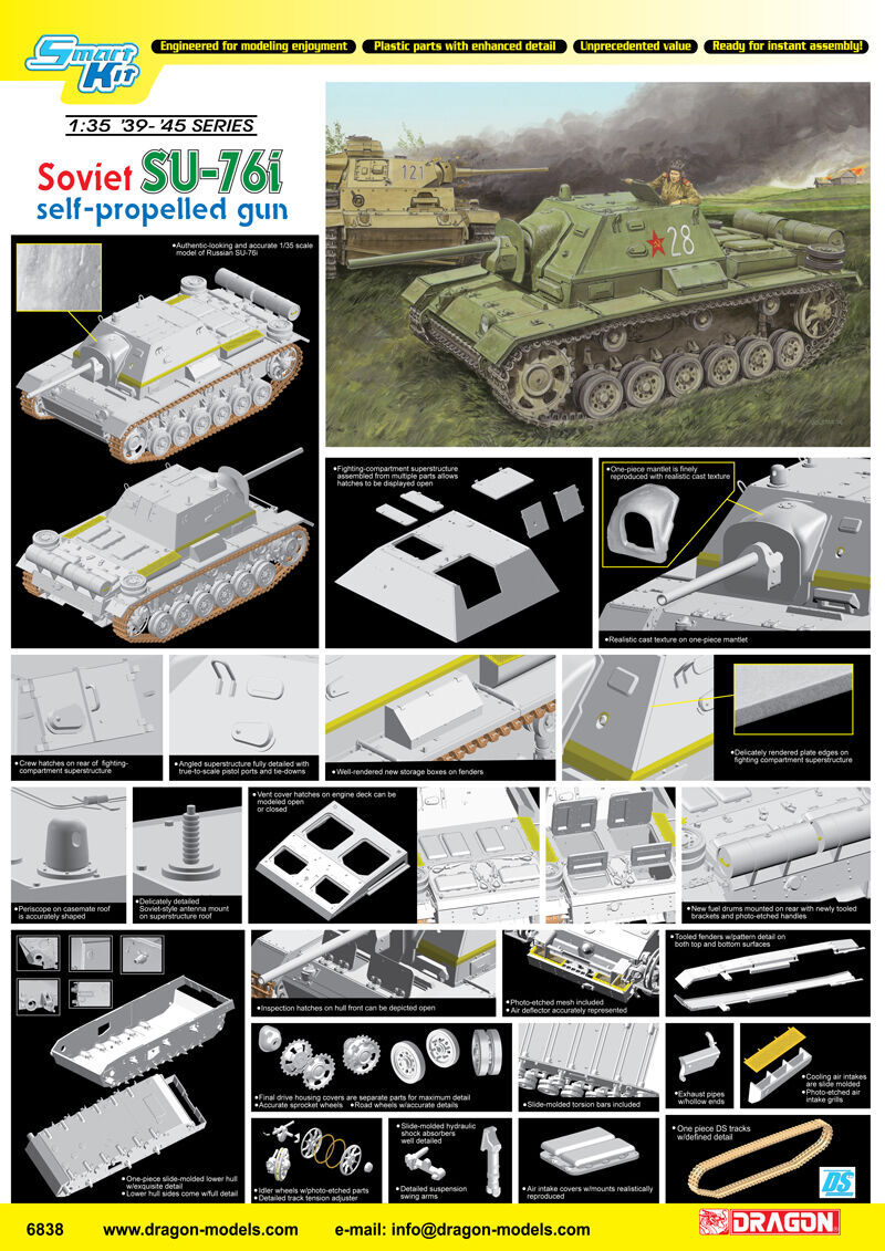 dragon has produced an exciting 1/35 scale kit of just such an su-76i spg in soviet service. It is logically based on dragon. S famous and highly accurate panzer iii chassis and hull, and of course the model features a brand new fighting compartment as was installed by factory no. 38. This superstructure features intricate bolt detail, and accompanied by two new storage boxes in both sides. Naturally, the correct gun and mount are also included. This was an unusual armored vehicle used by the soviets, but dragon has beautifully recreated this. Crossover spg. It takes the best of german chassis and soviet weaponry to create a brand new vehicle for the pleasure of modelers