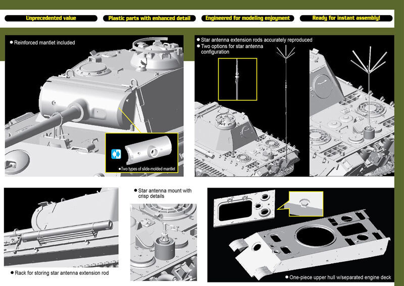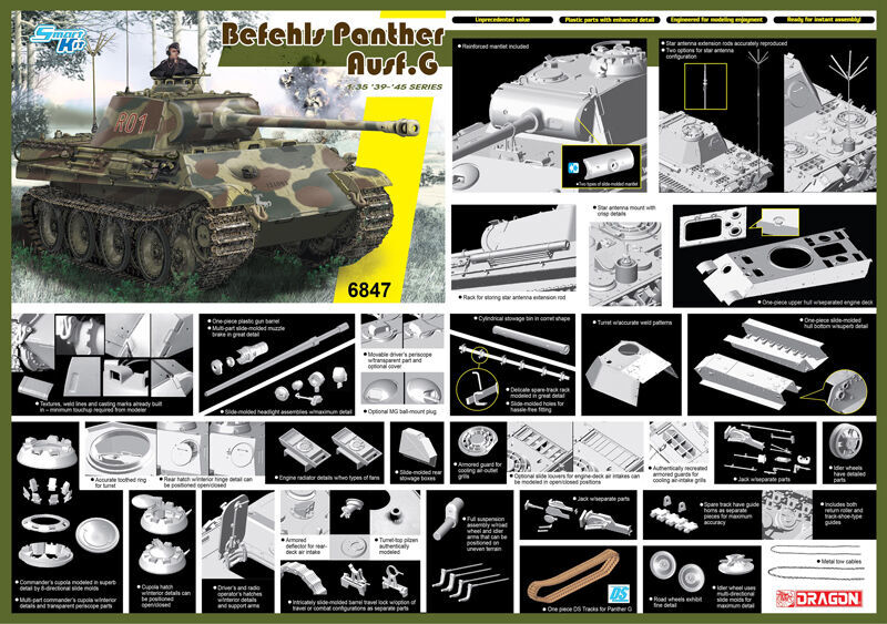 We are now offering a 1/35 scale kit of a befehls-panther ausf. G. As the name indicates, this command tank is based on a panther ausf. G hull. The kit thus inherits the best aspects of dragon. S phenomenal panther g kit family, with all the necessary additions typical of a befehls-panther. For example, there is a star antenna on the engine deck and the correct mantlet for a command panther is present. Ds tracks are included for easy assembly. This befehls-panther kit will command a lot of respect thanks to its accurate, even easier-to-build characteristics
