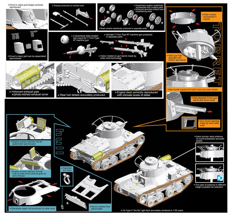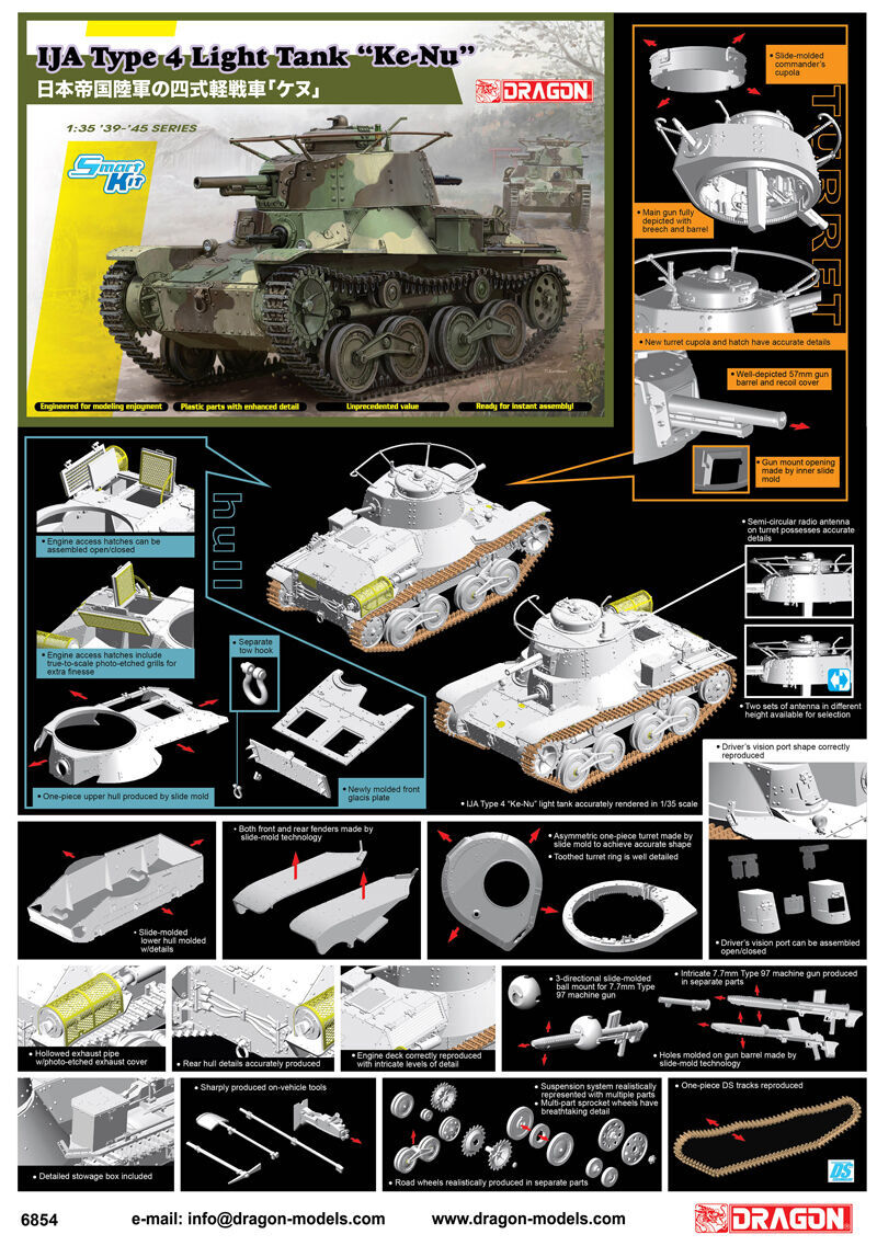 The type 4 ke-nu was a light tank used by the imperial japanese army (ija) in wwii. It was essentially a hybrid combining the hull of a type 95 ha-go light tank with a turret from the type 97 chi-ha medium tank. When the type 97 was up-gunned with a higher-velocity 47mm gun, turrets with the original low-velocity 57mm tank gun became surplus and were installed onto the obsolete type 95. The ija received approximately 100 examples of the type 4 ke-nu from 1944. While the type's firepower improved, the heavier weight of the turret added a ton of weight and thus reduced its maximum speed to 40km/h. The 8. 4-ton tank's thin armor could be easily penetrated by allied anti-tank weapons too. It was operated by a crew of three. Most tanks were retained on the japanese mainland in anticipation of an allied invasion, but some saw combat against the soviets in korea and manchuria. Dragon has produced a fine 1/35 scale plastic kit of the type 4 ke-nu. Indeed, this model is another masterpiece from dragon's team of japanese experts. The team conducted research on the real tank, produced highly accurate technical drawings, created the stunning box art and supervised the whole project to a successful conclusion. There are numerous new kit parts such as the turret with the characteristic ring antenna. Although the type 4's hull may look similar to that of dragon's type 95 ha-go kit, the glacis plate has been completely redone. This will be one of the most eye-catching 1/35 releases of the year from dragon, and it just proves the adage that good things do indeed come in small packages!