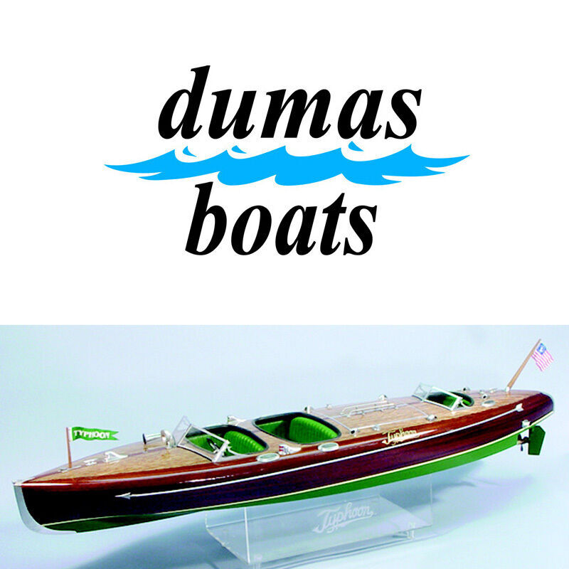 Dumas brings the excitement of the roaring 20s with a 1/10th scale model of the TYPHOON. Our exact scale model is based on a full scale reproduction built by Mark Mason, owner of the New England Boat AND; Motor Co. The construction is a double-planked hull with birch plywood on the inside and mahogany strip planking on the outside. A complete set of chrome-plated deck fittings is included to add the touch of charm and excitement to the elegant racer. Vacuum form seats with full cockpit instrumentation add to the charm. Running hardware including shaft, stuffing box, rudder, strut, and bronze propeller are included. Drawings and a easy-to-follow booklet will guide you through the building of this racing legend.