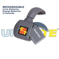 Since uitralite headsets feature self-contained. "aii in one" design all electronics, even the battery, is installed in the headset plastics. The batteries are lightweight and about the size of a book of matches. They charge in about 3 hours, run for 6 hours and can be changed out in seconds. Since they are lithium-ion, the batteries do not have to be drained after each use and will never develop a memory