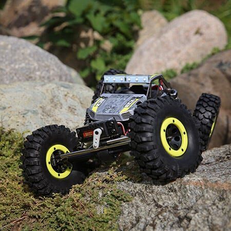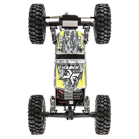 The ECX 1/18 Temper Gen2 4WD Rock Crawler is built to tackle any environment. This new and improved version builds upon the original Temper s outstanding reputation and sets the standard all other mini crawlers must follow. It sports a stylish and aggressive look with matching wheel rings, plus hidden compartment for the battery tray. The LED light bar keeps the fun going even after the sun goes down. A true 4-link suspension with improved articulation and strength is a substantial upgrade, while the larger servo mount and aluminum steering links allow for bigger servos to handle a higher power output. Designed for the consumer looking to join the scale movement, this crawler has everything needed to attack any terrain. Its high torque 380-size 32T brushed motor and waterproof electronics make hitting the trail easy. Grab some wood, some rocks, dig a few holes and you can create a course in minutes! Plus, you get all of this excitement without breaking your budget.