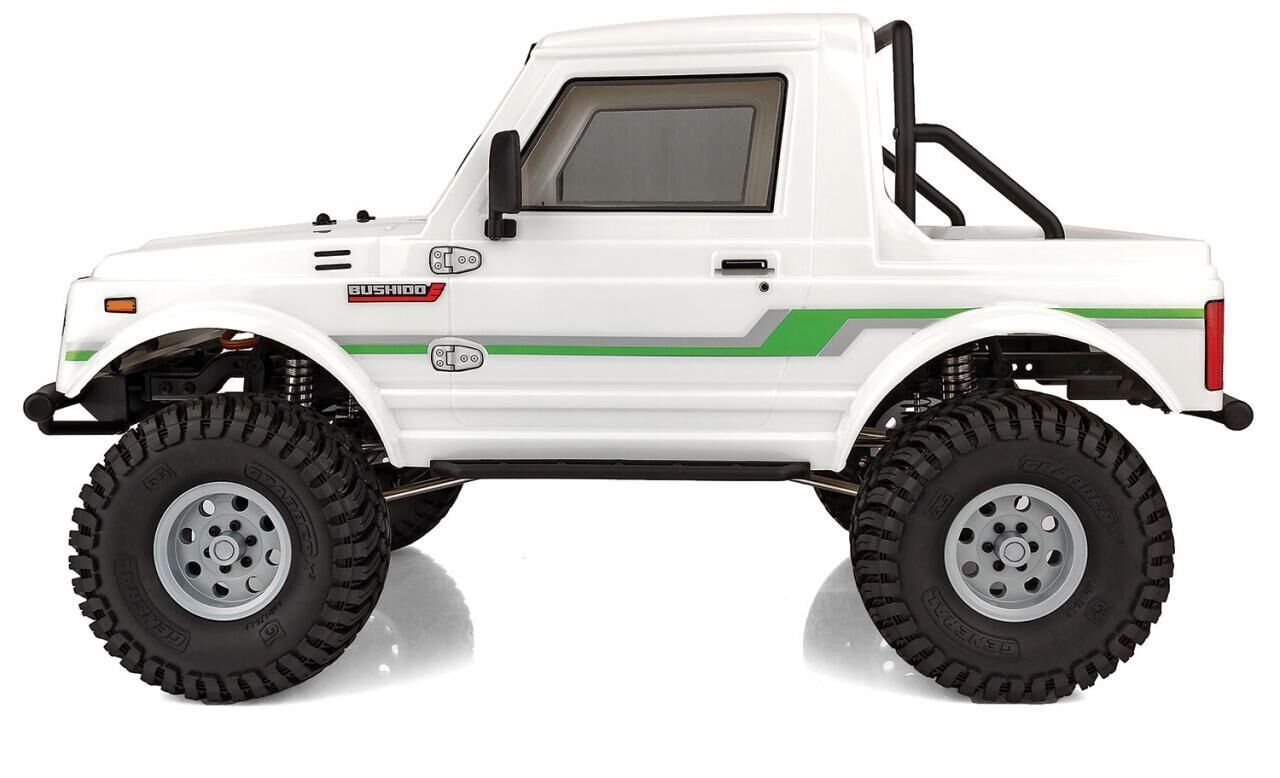 The single-piece polycarbonate body comes prepainted with clear windows and includes a highly detailed decal sheet along with extra decals for making the Bushido your own. With injection-molded mirrors, grill, wipers, snorkel, bumpers, and rear bed cage for added scale realism, this rig is sure to look great on the trail.