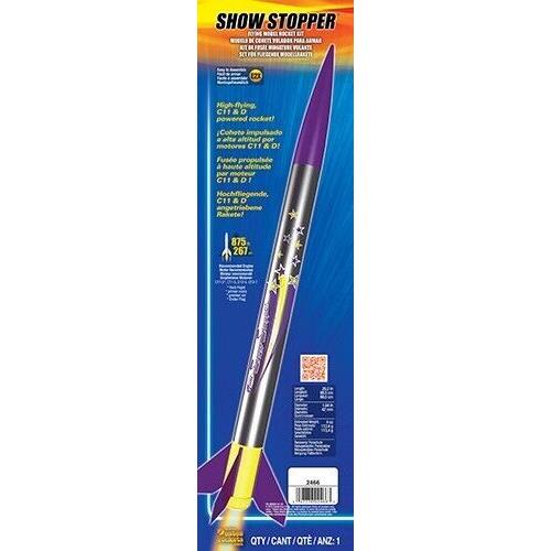 Chromed and almost ready for blast-off! The purple chromed nose cone and fins makes this rocket a real SHOW STOPPER! Blasting to almost 900 feet, the Show Stopper is powered by C11 and D Estes engines. And the chrome parts are EASY to see in the sky so you won't loose this one!