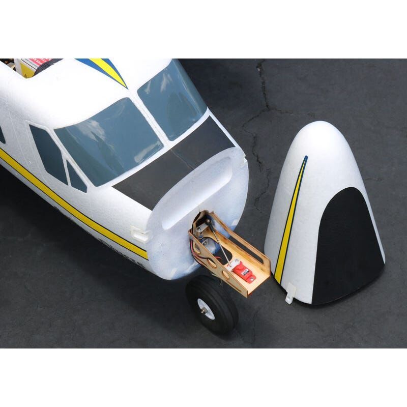 A single 6s 5200mAh 6200mAh LiPo battery sits on a removable battery tray, powering the counter-rotating Potenza 40 550KV motors swinging 14 6 propellers and are coupled with genuine 60-amp HobbyWing ESCs to create a simple and efficient power system. Despite the massive size of the airframe, with a 90? wingspan, the Twin Otter 80E assembles and disassembles quickly and easily with removable wings and stabs, breaking down into a much smaller and transportable package. Additionally, the optional wing bags allow you to protect the wings while leaving the props and spinners attached, further enhancing the ease of assembly and disassembly, while protecting from hangar rash . The Twin Otter features a hollow internal structure and incorporates plywood and carbon fiber in key locations. The innovative plywood sub-structures secure BOTH power systems to the wing tube, allowing both motors to operate smoothly even at high power and allows the airframe to remain rigid during tumbling maneuvers. Beacuase the Otter uses EPO foam it remains tough and repairable.