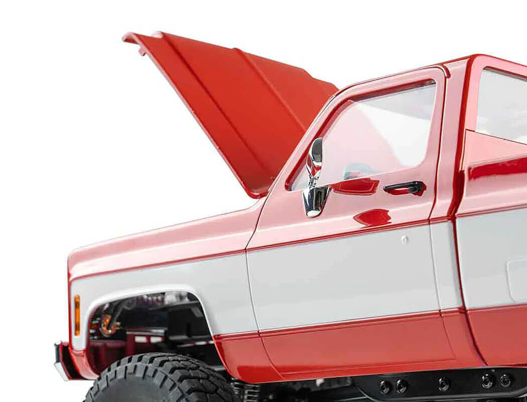 The FCX18 Chevrolet K10 uses a light control plug-in consistent with real carlight effects. The headlights, turn signals, and taillights are all operable via the remote control and automatically link to your driving actions. The rear lights automatically light up when braking or reversing, and the indicators flash when turning left or right, and the healights enable a cool night-driving experience. All of these come together to provide a fun and enjoyable driving experience.