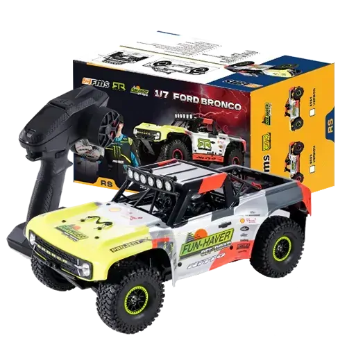 The FMS 1/7 Ford Bronco RTR EB is built with the same performance-first design as the full-scale Ultra4 race truck. It features true front independent suspension and a solid rear axle, all mounted to a rugged CNC-machined metal chassis. With eight aluminum oil-filled shocks, a high-torque steering servo, grippy licensed Nitto tires, and a premium brushless power system, it delivers sharp handling, serious traction, and high-impact funwhether you're bouncing through rocky trails, blasting across sand, or launching over jumps.