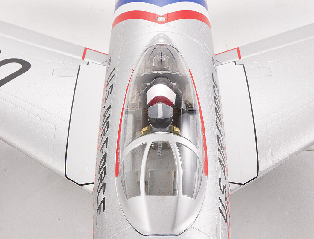 Building upon their extensive experience in developing remote-controlled model fighter aircraft, FMS has made significant efforts to faithfully replicate the legendary and classic F-86 "Sabre" with the product standard of "perfect appearance, excellent performance." The model is filled with numerous realistic details, such as operable landing-gear doors, retractable CNC-machined landing gear, movable airbrakes, wing navigation lights (red on the left, green on the right), jet nozzle navigation lights (one red, one white), and landing lights (white). The static model-level exterior details have also been meticulously addressed, including fuel tanks, cockpit interior (molded plastic parts), and antennas. It's worth mentioning that the interior plastic parts of the cockpit and the airbrakes have both undergone an antiquing process, creating a bridge to the past.
