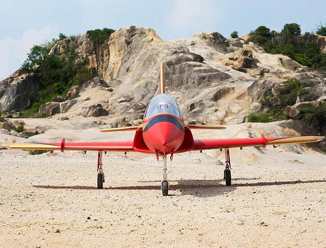 the fms 90mm avanti edf jet features cnc-machined kneeling metal landing gear with overload protection and blocked load mode, ensuring effective resistance during harsh landings and showcasing the durability of the large tires. The inclusion of high-adhesion damping silicone oil ensures smoother movement, more consistent shock absorption, and enhanced overall landing performance to handle various challenging ground conditions, accurately replicating the robustness and functionality of real plane landing gear