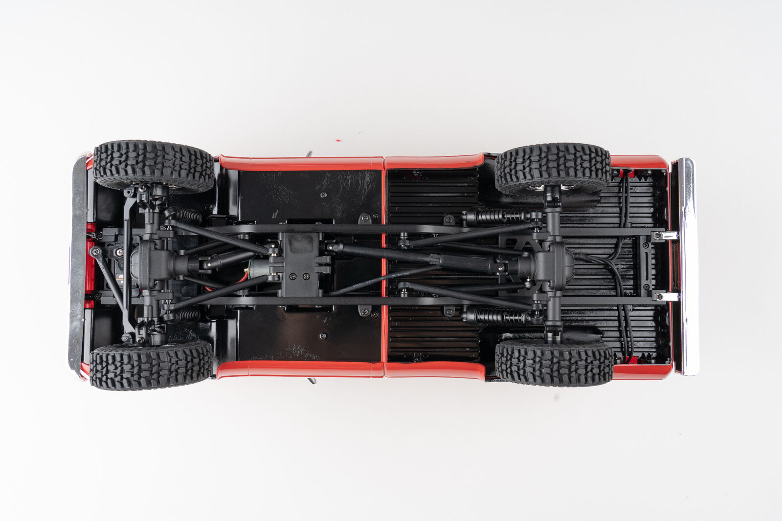 The 4WD chassis is engineered for durability, performance, and high-torque climbing capability, with metal beams, aluminum frame rails, and a reliable multi-link suspension.